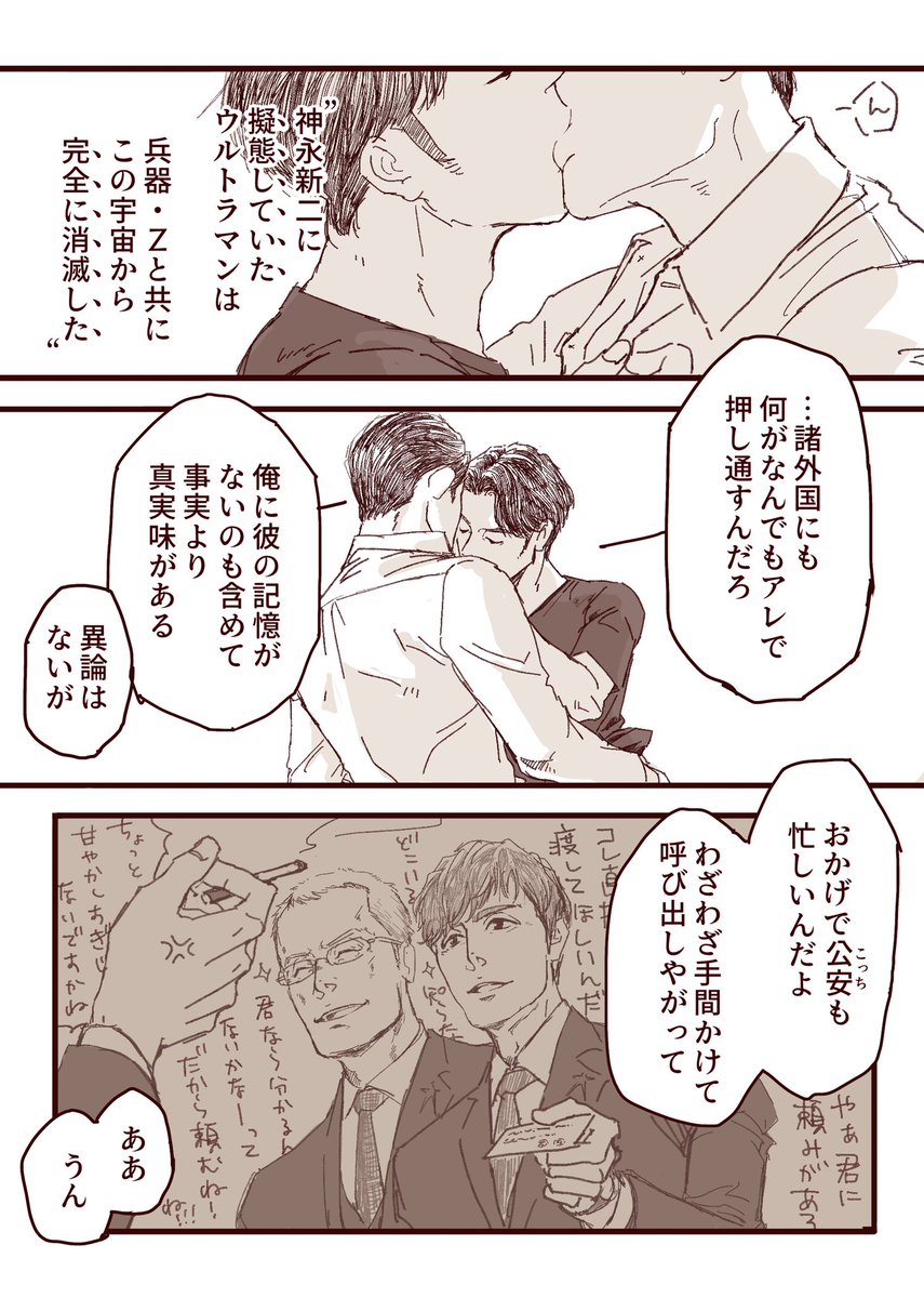 神永と加賀美③ ※R18を含みます※ 2316 らくがき 数字のリンク→元記事(Twilog)に飛びますが、飛ばなくて大丈夫です。 (参照元としてつけています) 漫画1本と絵多め 2317 2347 2359 2385 2419 早く起きたほうの特権 2443 2458 2463 2489 2490 映画後、加賀美が神永と会う話。 神永が戻ってきてから会うのは初。加賀美はたぶん有給とって来てる。 ふたりはなかよし(いつもどおり)。 1コマだけ班長と室長が友情出演してる。 2514#お題ガチャ #強受好過 神永に跨って「ストリップをご所望か?」って煽ってくる加賀美 2528 加賀美の流し目練習ついでに目パチで遊んだ ※PCだと再生されないかも 2536 先日の目パチはコレの途中で遊んでしまったやつです 神永の髪ファーなってるのは寝癖 2576 2603 初夜-"おかえり"の後 神加公安時代の初夜考えてみて、いやそれ初夜っつーか単に「初回」じゃね??ってなって詰んだんだけども。互いに直接的な事は言わないけど、自分の思いにも相手の思いにもそこそこ素直になって通じあって致しているという点では、神永帰還帰後の一発目が初夜なんでは、というとこに落ち着きまして。 2669 以上です、おつかれさまでした 神永と加賀美① 神永と加賀美② #シン・ウルトラマン