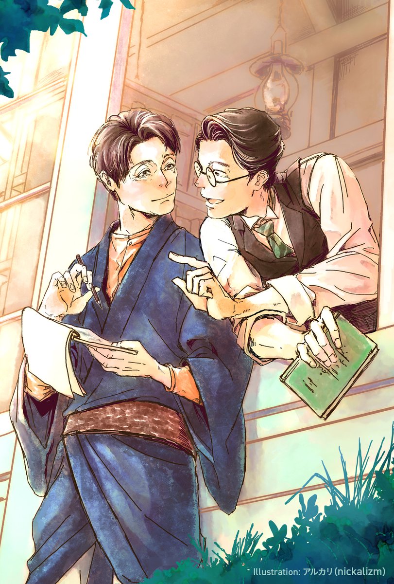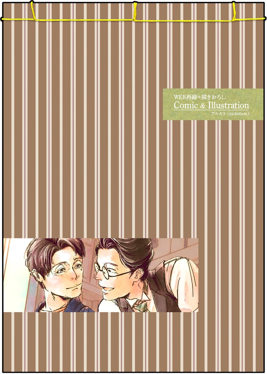 はたのみや新刊、アルカリの表紙と裏表紙とポストカードはこんなん。ちゃんとした告知は後でしまする。 製本されてきた本に穴あけて通すだけなので和綴本じゃなくて紐はマジで飾り。帳面風に仕立てたかったんでA5ヨコ本をタテ開きにしてみた。間違えてないと…いいな… #Twilog